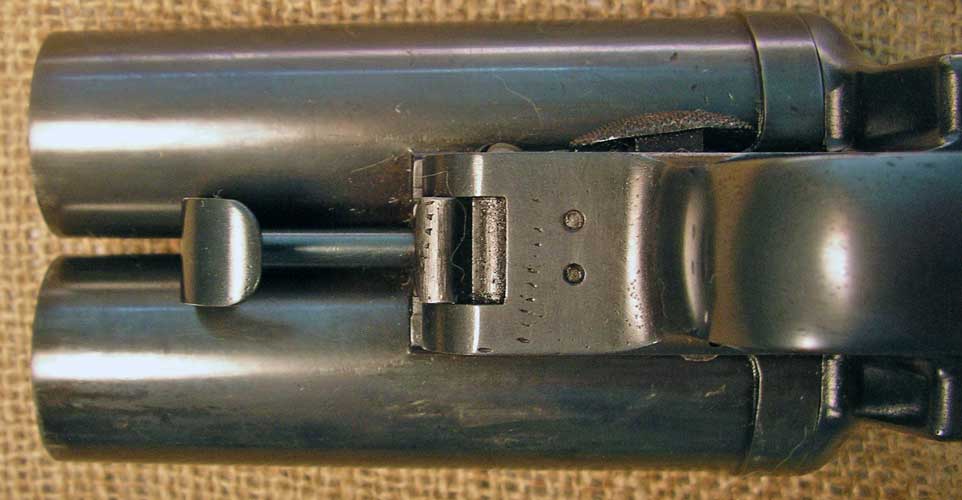 When it is moved forward, the action breaks open and you can see down the barrels. Note the small circular stud in between the two barrels at the bottom.