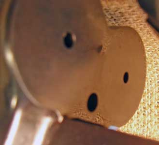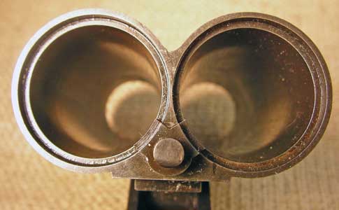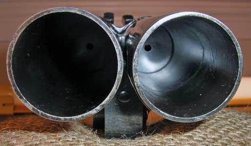 Here's a view from the muzzle down the barrels. You can see the firing pin hole in the left barrel (right side of the photo). I couldn't get the lighting right to show both at the same time.