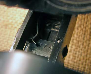 Looking down into the receiver, you can see the interior part of the safety with the serial number 375 on it.