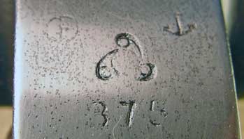 The markings are a little thin after polishing to prepare for rebluing, but still clearly visible. In the upper left of the photo below you can see in a small circle a Japanese katakana (phonetic symbol) to (pronounced "toe" as in "your big toe"). This is a naval inspection mark, and is found together with the anchor in the upper right on most Japanese naval equipment produced by private contractors. The large symbol in the middle is the logo of the Kayaba company. The serial number, 375, is at the bottom. These flare guns seem to have had a relatively brief production run, since it seems that production began around 1927 and probably ended soon after the more sophisticated Type 90 double and triple barrel models were designed in 1930-32. The Kayaba company made those, too. The Type 90 included spring-operated buffers to absorb some of the recoil (Kayaba also made shock absorbers for the Zero during the war, so they had lots of experience in such matters).