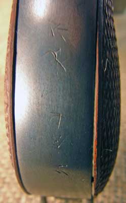 As noted above, one of the reasons I decided to have this gun restored was to undo the work done by some previous "gunsmith". I am pretty sure this was not done by the Japanese. For one thing, they would have had access to parts and proper repair facilities. But here is another clue: these characters scratched into the backstrap. They are pure gibberish, instantly recognizable as not Japanese to anyone with even the most basic familiarity with the language. It is actually fairly common to find Japanese artifacts with such nonsense markings. They seem to have been added by GIs seeking to enhance the value of their trophies with markings they could pass off as Japanese names or other information when they traded the items to other unsuspecting GIs (a high proportion of souvenirs were brought back by individuals other than those who originally found them: an active trade in souvenirs existed everywhere GIs gathered and had the time and security to do some horse-trading). .