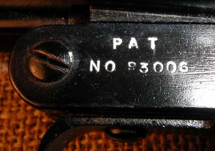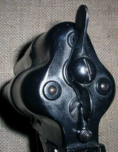Here is that break-open lever. Pulling it forward allows the barrels to swing downwards for loading or unloading. The shape of this lever is the easiest way to distinguish between the three variations of this model. The first variation has a vertical lever contoured to fit a finger, this second variation has a straight vertical lever and the third variation has a more horizontally positioned sickle-shaped lever. There are other differences, of course, but that is the easiest one to spot.
