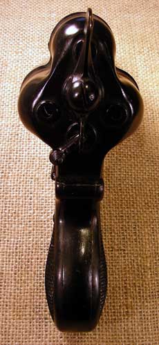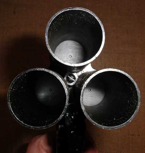 This is a closer, angled shot of the rear so you can see the levers on the back better. The upper lever cocks all three barrels when twisted to the left. The lower lever selects the barrel to be fired. When the bottom is to the right, it readies the right barrel for firing. When it is in the the centre, as in this photo, it fires the centre (top) barrel. When the bottom of the lever is moved to the left, the left barrel is ready to be fired.