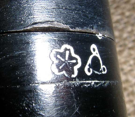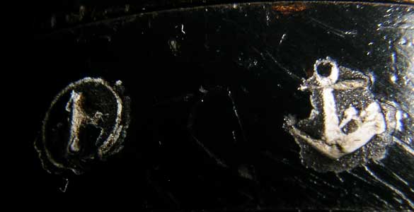 Here are the other two marks. The one on the left is the katakana symbol to, used as a naval inspection mark. The other is an anchor, the usual marking to indicate Navy acceptance.