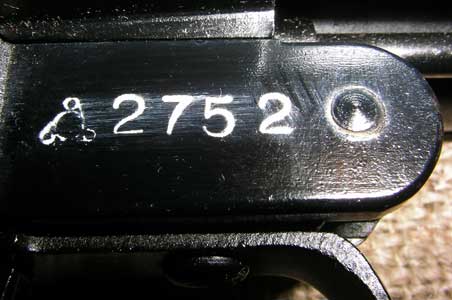 Here is the serial number, 2752, on the right side of the gun just above the trigger guard. The mark to the left of that, a large circle with three little ones around the outside, is the logo of the Kayaba Kogyo company. This company still exists. It is now known as KYB and trades on the Tokyo Stock Exchange under the stock ID number 7242. It makes shock absorbers, among other things.