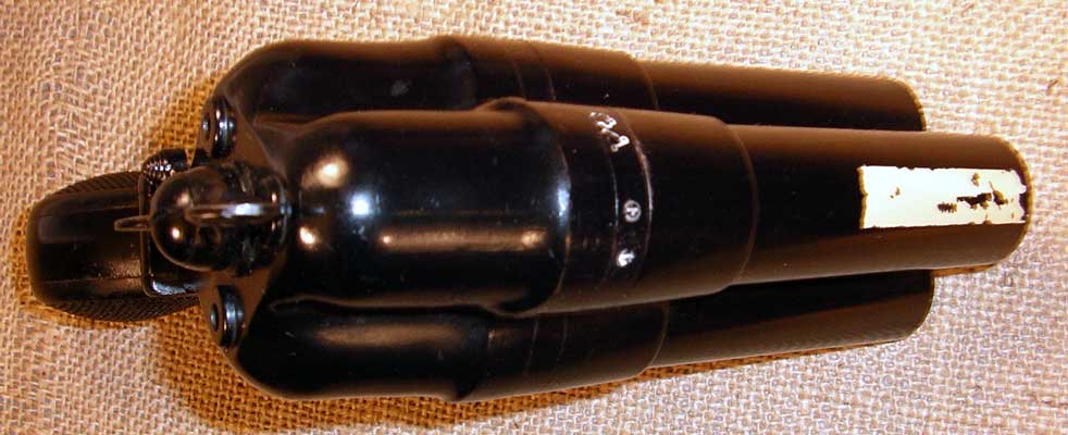 Here is the front view. I was surprised that the barrels were not joined along their length. Like other Naval flare guns, this one fires 28mm flares, unlike the Army model (the Type 10), which fired 35mm ones.