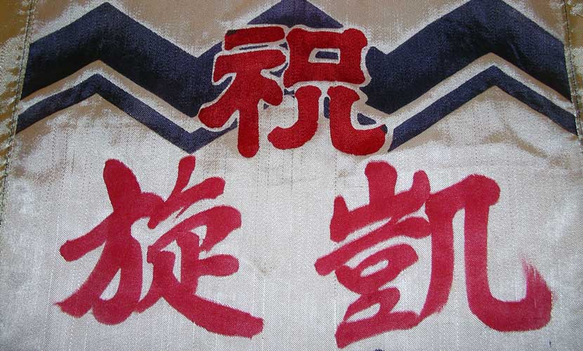 Next is a banner that would have been carried in a welcome home parade. In form it is very much like the banners used in send-off ceremonies, except that it says shuku gaisen at the top (the large characters in the lead photo on this page came from this banner). The soldier's name is down the middle: Maekawa koji-kun=Mr. Koji Maekawa. Along the left edge is the sponsor of the banner, kobe moto-machi roku-chome tomiya kofukuten hiroishi sue=Mr. Sue Hiroishi of the Tomiya Dry Goods Store, 6-chome, Moto-machi, Kobe (the last part is an address in downtown Kobe, one of Japan's main port cities). The right edge has the soldier's unit: Kita manshu hakken-gun, dai-kyu rentai, Dai ju-ichi chutai=North Manchuria Expeditionary Army, Ninth Regiment, 11th Company. According to the US Army's Handbook of Japanese Military Forces, October, 1944, the Ninth Regiment was based on Kyoto, not far from Kobe. This banner is made of silk or a similar material and is 42.5cm (16-3/4") wide and 140cm (55") long, not including the 7cm (2-3/4") fringe at the bottom.