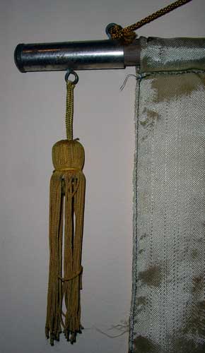 The banner still has its original mounting hardware. Here is a close-up of the decoration at one end of the crossbar (the wooden bar is 55.5cm=21-3/4" wide).