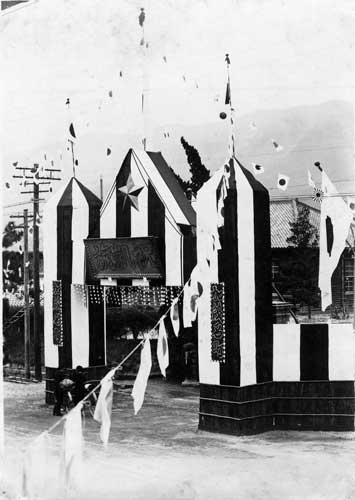 First, here is a period photo from my collection showing an arch erected for a homecoming ceremony (please see copyright notice below). The characters on the sign above the passageway (just below the star) are shuku gaisen. The signs on the two sides are the location within the city. I think this photo was taken in Tokushima around 1932-33. It is not specifically labeled as such, but the album it came from belonged to a soldier from Tokushima and had photos from his participation in the First Shanghai Incident, which was in 1932. The original image is 105mm X 150mm (4-1/8" X 5-7/8") plus a 1.5mm border