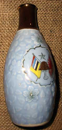 This sake bottle has the Japanese rayed Army flag on the right crossed with the Manchukuo national flag on the left (yellow with stripes in the upper quadrant). On the helmet in between them is a name in gold leaf: Sugawara.