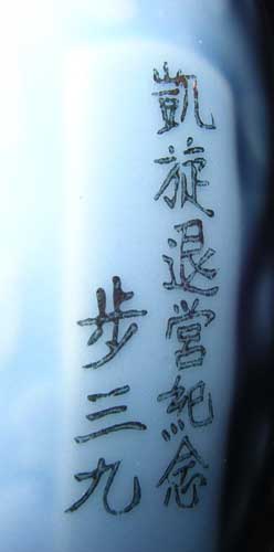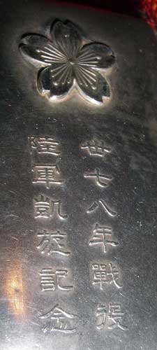 Here is a close-up of the side that explains what it was for: the upper band of characters reads from right to left: Manshu jihen gaisen jotai, and the large characters in the centre read ki-nen. Together they mean "to commemorate your triumphant return and departure from the service". The bottom gives the date: Showa nana-nen=Showa 7, or 1932 AD.