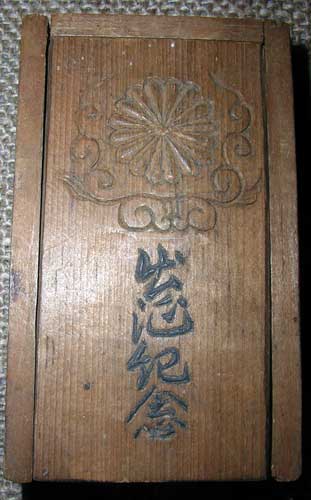 This next item does not actually have the word gaisen on it, but the contents are what was commonly given to soldiers as a gift from the Emperor on their triumphant return from a campaign. I bought it at a small antique shop in Okinawa in 2006. The box itself is hand carved, as is evident from its skilful yet slightly skewed construction. The characters on the sliding top say shus-sei ki-nen, "in commemoration of active service". The design at the top is, of course, the chrysanthemum, the symbol of the Imperial family.