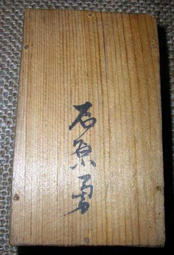 Here is an extreme close-up of the very tiny hallmark on the back (bottom) of the box. The upper, vertical cartouche is only 5mm long and 2mm wide, while the lower, horizontal cartouche is 3mm wide and 1.5mm high. The upper column says tama-ya-sei, "made by a jeweller". The bottom part reads right to left and says jun-gin, meaning "pure silver". What the Japanese definition of "pure" was, I do not know. Sterling silver is 92.5% silver and was and is the standard in Western countries, so perhaps it was the same. The metal is fairly soft and quite heavy, which would be consistent with a high silver content. The bottom is tarnished but the top and insides are polished bright.