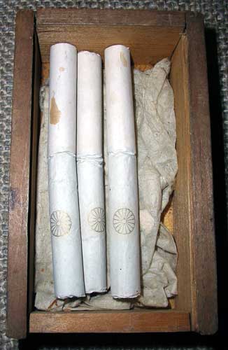 Here is the real prize: the gift cigarettes the soldiers received from the Emperor, complete with the Imperial chrysanthemum. They are very old style cigarettes with tobacco only in the part below the kink you see in them (about 4.5cm, or 1-3/4"). The rest (the upper part in the photo, 3.5cm or 1-3/8") was a hollow cardboard tube as a sort of holder. The Russians called this style of cigarettes papirosy. They would have been given in a small white cardboard box with the characters onshi (Imperial Gift) on the top. I have a similar box, but it is post-war. I have seen original ones in the Navy Kamikaze museum in Kanoya, Japan.