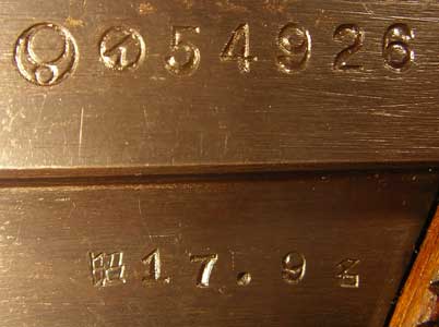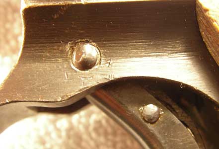 Here is the head of the trigger hinge pin on the right side. Note how the end has been swaged to keep it in place and rounded. Later guns (starting in Showa 18.2=February, 1943) had the heads machined flush. Note the last two digits of the gun’s serial number are visible on the right side of the trigger near the top. The third-last digit is also there but is hidden inside the trigger guard frame.
