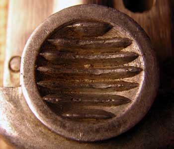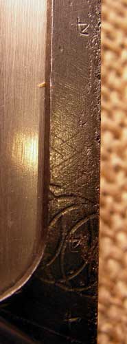 Here is a close-up of that small left side marking referred to above. It is the katakana se, and indicates that the gun was assembled at Kokura. All Tokyo and Kokura Type 14s have a mark in this spot (called the "C position"). Magazines for Tokyo and Kokura pistols should always have the same inspection mark as the one in this C position, according to a recent article by Dan Larkin in Banzai.