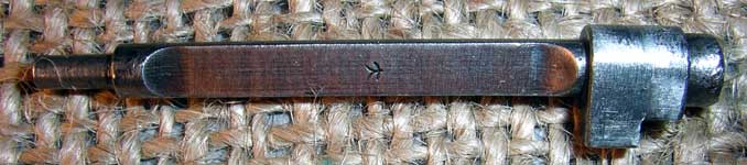 The striker spring guide (also called a firing pin extension) has flat sides, a Kokura innovation according to the Derby & Brown book. By reducing the contact area with the inside of the striker (firing pin), this helped to reduce misfires due to ice formation in cold weather. The small inspection mark visible in the middle of the flat looks a bit like a droopy version of the kanji dai, but that is not a known mark for Kokura parts like this.