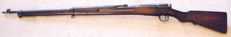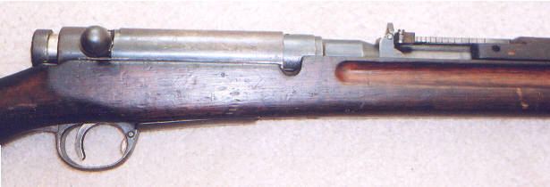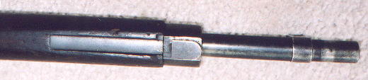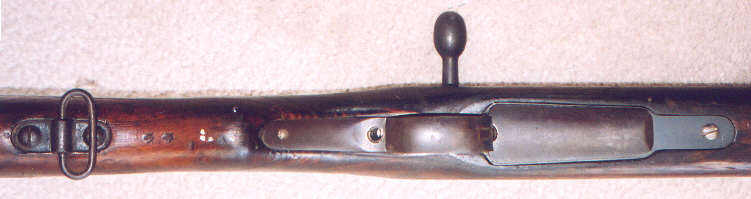 The bottom of the gun up by the muzzle shows the cleaning rod release lever just below the bayonet lug. Unfortunately this gun is missing the cleaning rod.