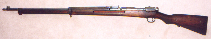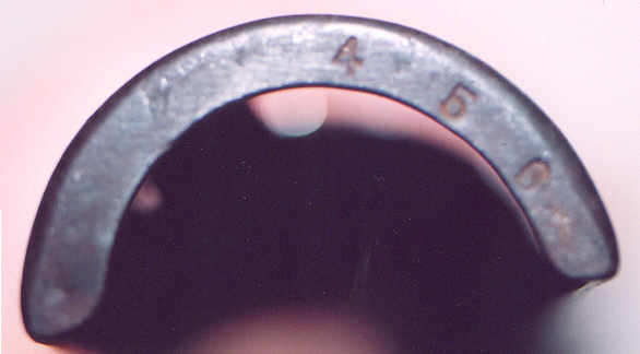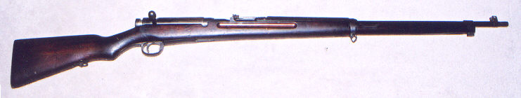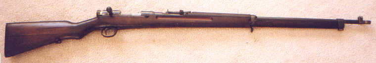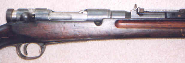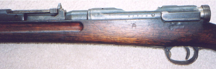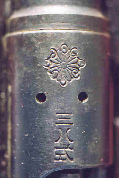 Here are the markings on the top of the front of the action just where it joins the barrel. The marking at the top of the photo is the Imperial Chrysanthemum. As with most surrendered weapons, it has been defaced. Usually it was ground off as on my Type 99 (see T99 section), but here it was defaced with the stamping of eight zeroes around the outside circumference. The two holes are for venting gas in case of a cartridge rupture (better upwards than back in the firerfs face). Below that are three kanji characters: san-pachi-shiki, gthree eight typeh, or Type 38. The Japanese soldiers usually called this rifle the sanpachiju (38 gun) for short.