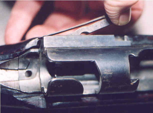 On the left side of the receiver, just above the bolt handle in the photo above, is the bolt release lever. Here is a shot of how you move it to get the bolt to come out the back (i.e. towards the left in this photo).