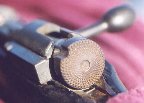 This is the back of the safety. Note the fine knurling in contrast to the rough finish on the rear of the safety on my Type 99. The bolt and gun numbers do not match. I think this is a later bolt and safety since it has a notch rather than a tang.