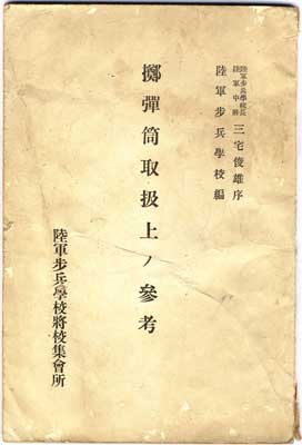 My other manual is much larger, 148mm by 221mm (5-7/8" X 8-11/16"). It has 78 pages and is dated June, Showa 13 (1938). the content is much different, with a lot of very technical close-up diagrams. The cover has the title in large characters in the column in the centre: teki-dan-to-tori-atsukai-jo-no-san-ko (Reference on the Handling of Knee Mortars). In the upper right corner it says it was compiled by the Army Infantry School and has a preface by the head of the school, Lt. Gen. (Chusho) Toshio Miyake (the Japanese Wikipedia site on the school says he was its head from August 2, 1937 to June 25, 1938). The lower left says riku-gun-ho-hei-gak-ko-sho-ko-shu-kai-sho. "Army Infantry School Commissioned Officer Assembly Hall". The title and this last line are repeated on the spine.