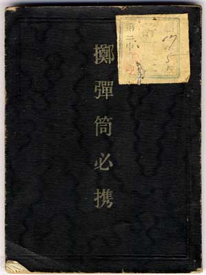 I also have two manuals that are solely on the knee mortar. This first one is just slightly larger than the typical small black pocket manual format. It is 92mm by 125mm (3-5/8" X 4-15/16") and has 90 pages. The date in the back is May, Showa 14 (1939). The title in light golden colour on the front is teki-dan-to-hik-kei, "Manual on the grenade discharger". The little sticker in the upper right corner is a sort of ownership stamp, it seems. There is very faint green printing on it with numbers penned in with dark blue or black ink. The far right column says Sho-wa 17 5 gatsu (May, Showa 17, i.e. 1942). The middle column says kyo-ka-sho (permission stamp). The column on the left says dai-ni-chu-tai-cho (commander of the second company). The lower left corner of the tag has a red signature stamp on it but it is too faint and blurred to read (there is a name stamp inside the back with the name Okayasu, but I can't tell if this is the same name). It is mostly text with the same sort of diagrams as above. There is one cross-sectional diagram at the back, but my other manual has a larger and clearer version of the same diagram, so I have reproduced it below. The title is repeated on the spine. The back is plain black.