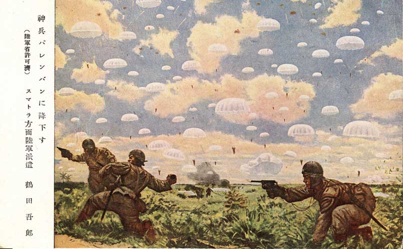 caption on the left says "Paratroopers landing in Palembang. Army sent to Sumatra