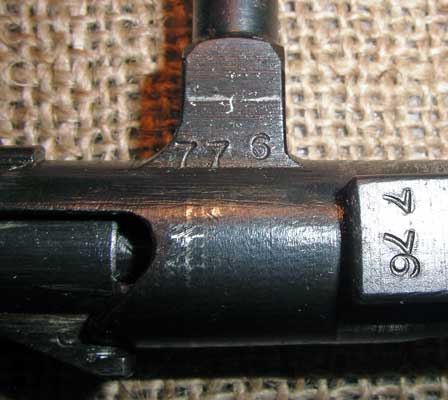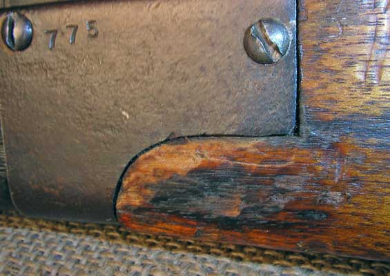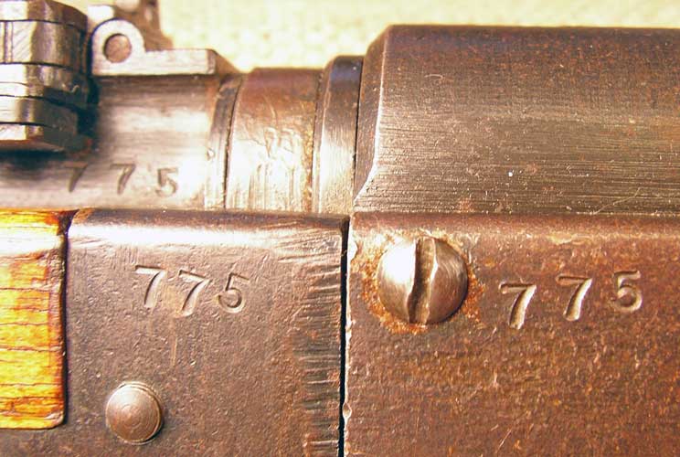 The two halves and the barrel are also marked on the left side with an assembly number, in this case 775. This number bears no relation to the serial number; it is only a coincidence that it is so close in this case.