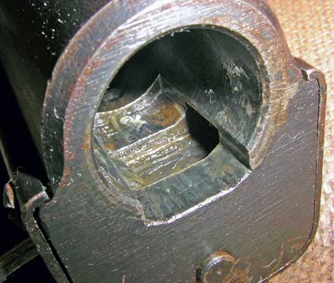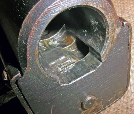 Here is the connecting part of the front half. Note the indexing hole to the right of the photo (it's below the barrel when the gun is oriented normally instead of being on its side). There is a peg on the front part of the rear half that fits in that hole to line things up. Now, take a look at the bottom of the barrel. See that notch? That's what the wedge fits into to hold the two halves together. The next photo shows it from a better angle.