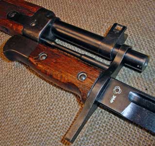 Now let's take a tour from the muzzle to the butt of the rifle. You can see here that the front sight is protected by metal ears. The tip of the cleaning rod is also visiible, and at the very bottom, the stud for fixing the bayonet.