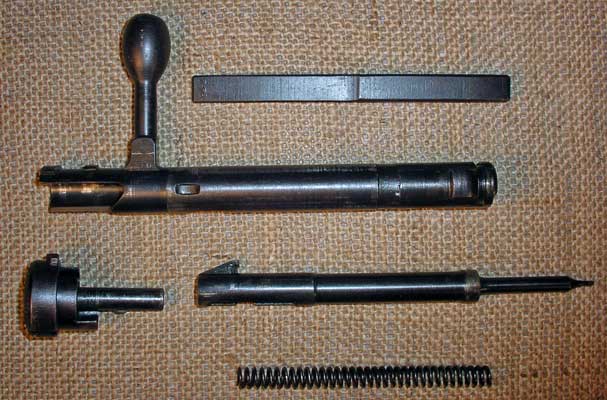 To strip the bolt, just give the safety knob a quarter turn. It comes off and the rest of the parts slide out. This photo shows the extractor (top), bolt body (centre), safety (lower left), firing pin (lower right) and firing pin spring (bottom right).