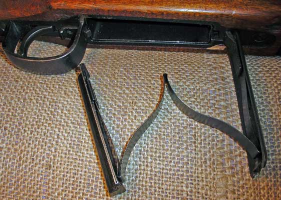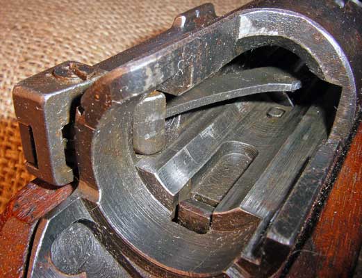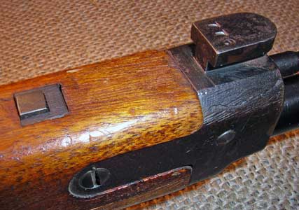 This is a shot of the bottom of the gun. Note the whole in the bottom of the stock at the far right, just forward of the area where the two halves join. This was to drain water out of the stock if it got wet so the water would not get trapped there and rust the barrel.