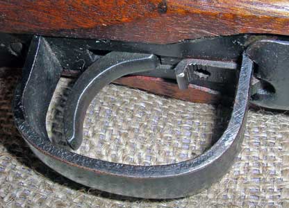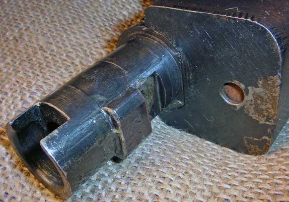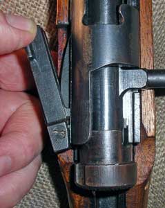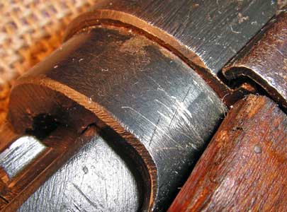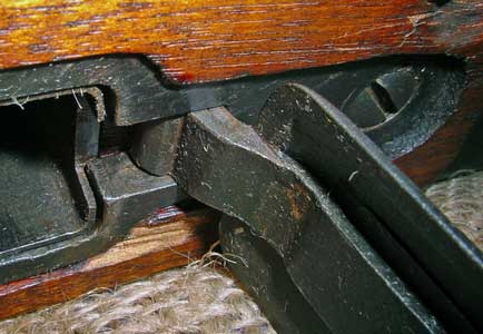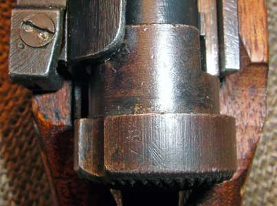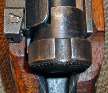 Here are two shots of the safety. On the left the safety is in the off ("fire") position, while on the right the safety is in the "on" ("safe") position. Note the positions of the indicator notches; straight up is the "safe" position. HOWEVER YOU SHOULD NEVER RELY ON THE SAFETY ON ANY FIREARM. ALWAYS TREAT THE GUN AS IF IT WERE LOADED AND READY TO FIRE! If you have a matching Arisaka, the safety will probably go into the on and off positions fairly readily. However, if the gun is not matching, you may have a lot more trouble and it may not go into the safe position at all. This is because the guns were made with a lot of hand fitting and so the lug a non-matching safety may just not fit into the appropriate notch. This one matches and so the safety works easily. A lot of people think Arisaka safeties are way too stiff, but this is usually because they are not operating them correctly. Engaging the safety requires compressing the firing pin spring, which is quite powerful. So the trick is to use the heel of your hand, not your finger tips. Hold the gun by the small of the stock in your left hand and use the heel of your right hand (the lower part of the palm near the wrist) to twist it on and off. That way you are using the strength of your arm, not just your fingers. Easy once you know how.