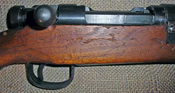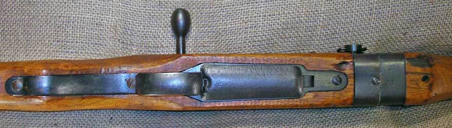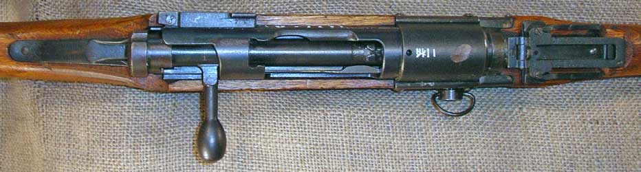 Top view. Note the plum shaped knob on the bolt handle and the Mauser-style bolt release (upper left of photo). You can also see where the stripper clip of ammo would fit in (the front of the bridge just ahead of the bolt handle).