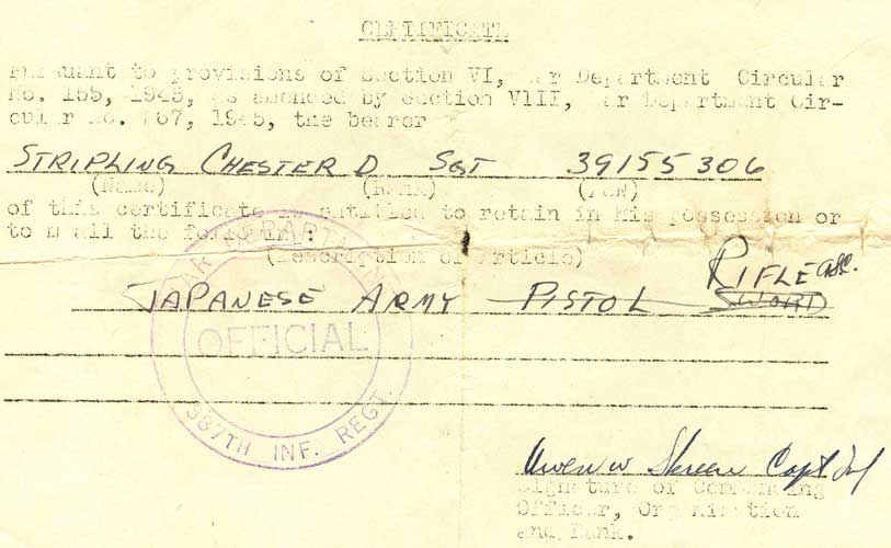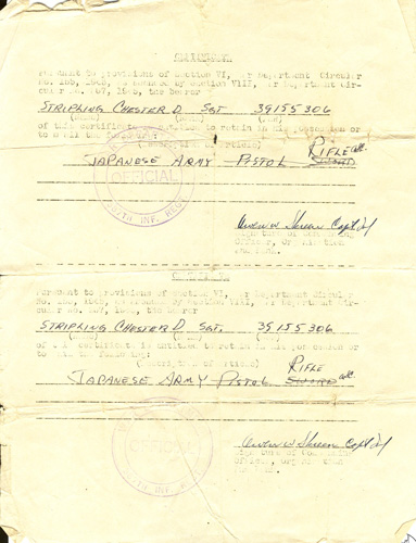 This is the "bring-back" document for this rifle. US servicemen required such a letter to authorize them to bring back war trophies. This one was made out to Sgt. Chester D. Stripling and signed by Infantry Captain Owen W. Skreen. It bears the seal of the 387th Infantry Regiment. From Sgt. Stripling's daughter I learned that his ship was headed for the Pacific Theatre, but when Japan surrendered he ended up in Tokyo. He acquired the rifle while serving in the early part of the US Occupation of Japan. I have a separate letter from her attesting that this document was issued in connection with this rifle, since the document itself does not include a serial number (many did not).