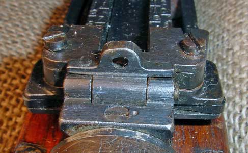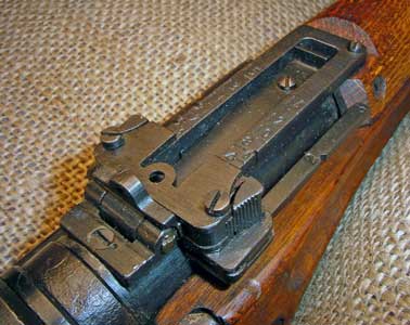 Let's start our detailed tour with the markings. Here is the top of the receiver. As noted above, the Imperial chrysanthemum, usually shortened by collectors to the "mum", has been ground off, but you can still see some around the edges. The grinding of the mums was reportedly done to spare the Emperor the embarrassment of having his symbol fall into enemy hands (actually the Japanese always either cancelled the mum or ground it off on weapons that were withdrawn from active service in the Imperial Army or Imperial Navy, even when they were sent to allies or to other departments of the Japanese government). Below that are two kanji characters, ni-shiki, or "Type 2". The hole below that is a vent hole for gases to escape in the event of a case rupture. All Japanese rifles had this feature. The earlier Type 38s had two holes; when the Type 99 was introduced, they decided one would do (the Type 2 is a derivative of the Type 99).