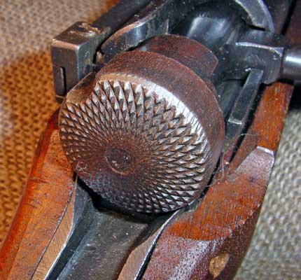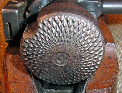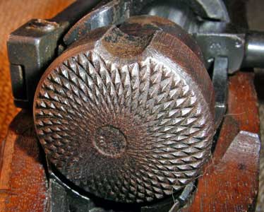 The safety was still made with the elaborate radial checkering. The notch is the position indicator. The safety is off in this photo.