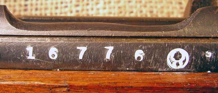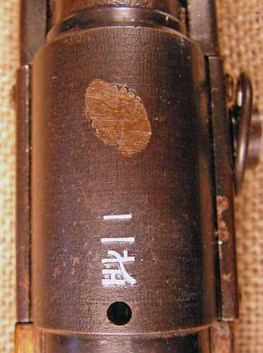 The serial number, 16776, is on the left side of the receiver. Since total production was a little over 22,000, this one was made about 3./4 of the way through the production run. The mark after the number is the Nagoya Arsenal logo. Nagoya was the only arsenal to make these rifles. The small square in the upper right of the photo is actually a partially struck kanji character na (as in Nagoya), which was used by Nagoya Arsenal as an inspection mark.