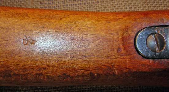 Just to the rear of the lower tang is a stock inspection mark. It is applied so that to be read properly the gun should be held muzzle up.