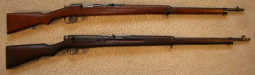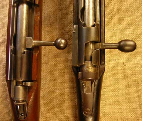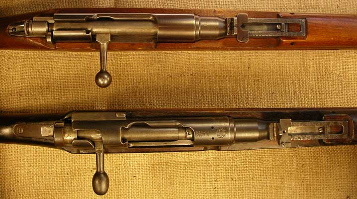 receiver, while the Type 38 below it has a bridge in front of the bolt. The