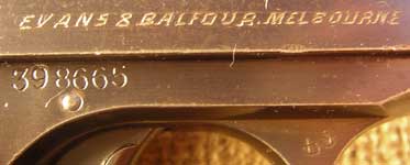 The right side has the name of Evans & Balfour, Australian gun merchants, and the serial number, which is within the range from which Japanese purchases are known to have been made. There are also a couple of small inspection marks at the upper front of the right side of the trigger guard. Japanese private purchase guns seldom have Japanese markings and were sometimes acquired through unofficial channels, such as when a Japanese ship was visiting a foreign port that had a gun shop. I have no reason to think this specific pistol had a Japanese connection, but there is no way to know for sure.