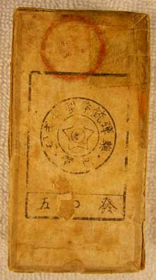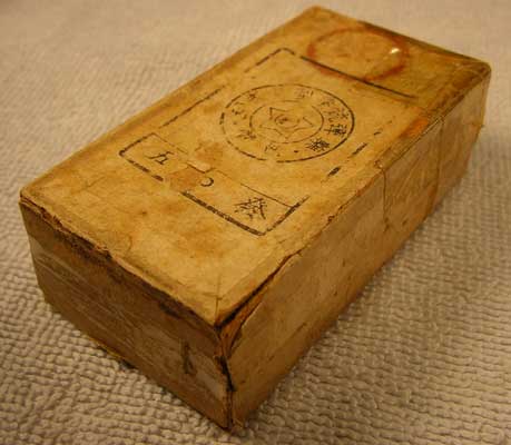 The top of the box has a now-illegible red stamp, a circular label and the line go-ju-hatsu (50 rounds) at the bottom.