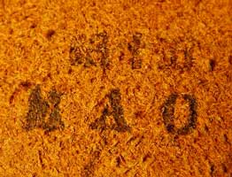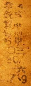 The markings have two vertical columns of four characters each at the top. They are read right column, then left column: mo-shiki-chu-gata-ken-ju-jip-po (Mauser-Type medium-sized pistol live rounds). Then there are two horizontal rows: 03, with the three written in kanji, and then 302 in Western-style numerals. The bottom two rows appear to be the date. The single character second from the bottom is Tai as in Taisho. The bottom has eight written in Kanji and nine written in Western style. This would seem to indicate a manufacturing date of Taisho 8, ninth month, i.e. September, 1919.