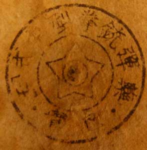 That circular label has the Tokyo First Arsenal symbol in the centre. The markings read clockwise and start about 7 o’clock, after the dot: mo-shiki-chu-gata-ken-ju-dan-yaku, i.e. “Mauser-Type medium-sized pistol cartridges”. In between the dots at 5 and 7 o’clock are the two characters jip-po, i.e. “live rounds”.