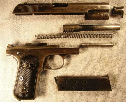 Here is the Colt field stripped. I found it easy to get apart, less easy to get back together. Note that this is an early model with a separate barrel bushing (upper right corner of photo).
