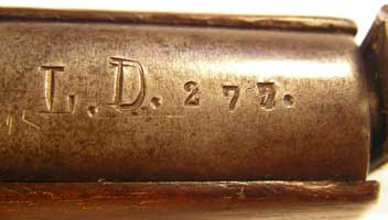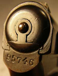 The ID markings L.D. 277 are stamped on the front grip. Someone who was reading this site e-mailed me with the key to their significance. Apparently the L.D. stands for Landjaegerai Duesseldorf. He referred me to a website on German weapon markings at German Police Unit Marks, 1920-1937. The Landjaegerai (literally “country hunters”) were apparently a sort of rural constabulary like a sheriff or reeve’s office.