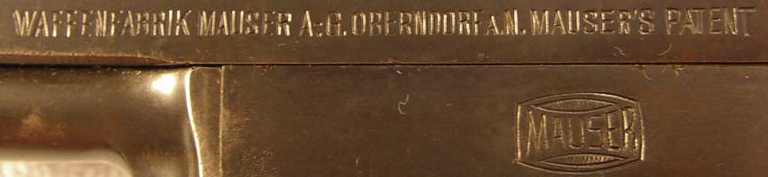 Here is the left side. The little grooved lever below the Mauser banner is the safety (down=safe). The button just below that is the safety release. The grips on these pistols are one-piece wrap-arounds that leave only the front grip strap showing.