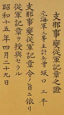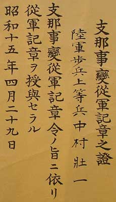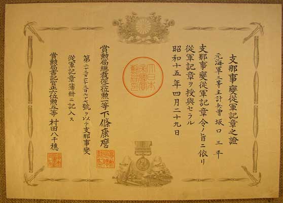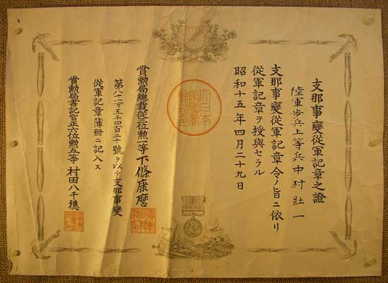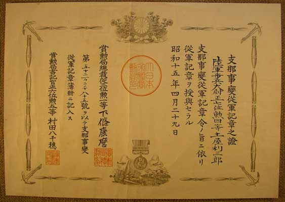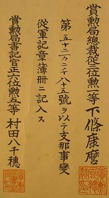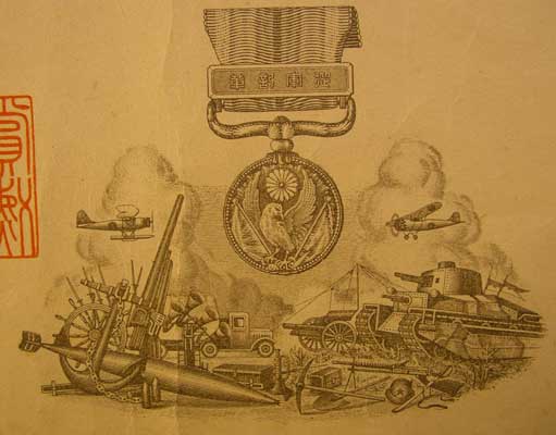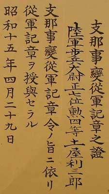 service medal”. The smaller column in the upper right says Shi-na ji-hen, or “China Incident”. The small writing in the far