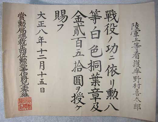 awarded to Mr. Yoshitaro Nomura along with an Eighth Class Order of the Rising Sun and 250 yen in